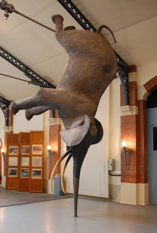 This elephant is a taxidermy by Daniel Firman, who concluded that, at a distance of 18000km above the earth an elephant could balance on her trunk – why she would want to!!!!