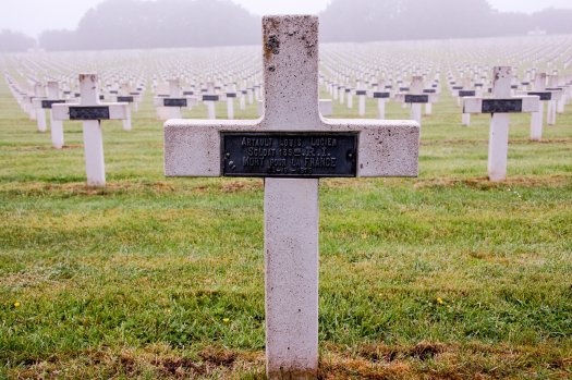 The day started very foggy and on route we came across the cemeteries of Le Targette, where the French and British have resting places side by side. All of the cemeteries we have visited have been peaceful, even serene places but the weather gave Le Targette an eerie feeling. The French side is simple with crosses marking the graves, the British has the traditional Portland stone headstones.