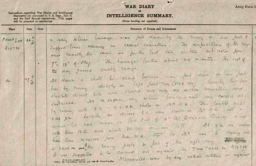 The War Records of the regiment at the time have the regiment in Ayette creating outposts; on 26th they were on the front line at Ayette. There is also a mention of a raid on a Gerry post. I probably should have researched this before I came away, and over the last few days, googling birth records, down loading war records etc I wish I had! They make interesting reading…