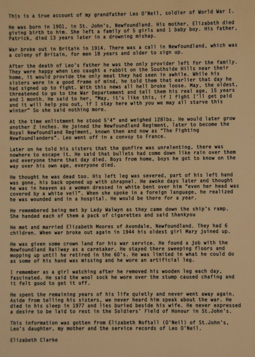 There is a small exhibition centre at the entrance to the site with documents the impact the First World War had on the people of Newfoundland and Labrador both at home and overseas, through the stories, photographs and mementos of the people who lived it. I found the following recollection very moving….