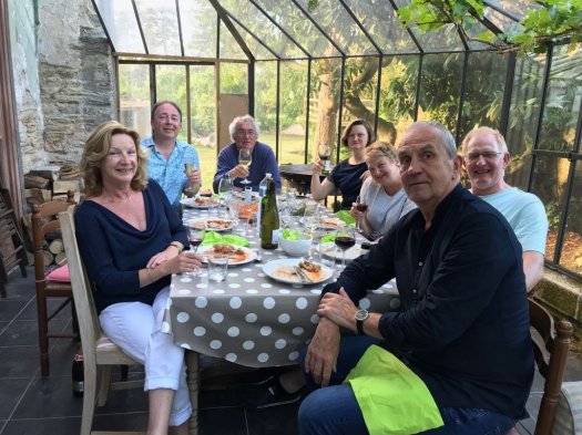 The decision next morning was should we do the town and beaches and arrive later with Sara and George in Malestroit, our last stopover of this trip or rattle on and come back this way again? We decided to head on (the plan is brewing for another adventure). How glad were we that we did….. Arriving in Malestroit just before 1pm, we parked in the square as directed and Sara came out to meet us – narrow streets, not much space was the reason given. As we parked I spied another English SLK…. Oh look!! Still oblivious to anything untoward! We got in to the house , hugging George, chittering away when Sara opened the door at the opposite end of the kitchen and in walked Kate & Tony from Yorkshire and Katherine & Chris from Wiltshire…. that led to some squeals, tears and lots of hugs. Both these couples had missed our retirement party because of the snow in March. It was just such a wonderful surprise. Paul met Sara, Kate and Katherine when he was on a public leadership course in the early 2000’s and we have kept in touch ever since. So made up that we are all together for the last days of our holiday.