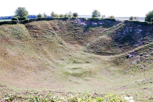 Our final stop was at the Lochnagar Mine Crater Memorial, the largest manmade mine crater created in the First World War on the Western Front. It was laid by the British 179th Tunnelling Company Royal Engineers underneath a German strong point called “Schwaben Höhe”. The mine was exploded two minutes before the 0730am zero hour at the start of the Battle of the Somme offensive on 1st July 1916. Despite the successful blowing up of the mine and damage to the strong point, the German’s managed to get in to good position to fire at the advancing British troops killing many hundreds within the first half hour of the attack. The mine is now the private property of an Englishman who bought it to preserve the site and the memory of those lost. He organises a work party the second May Bank Holiday weekend every year to carry out maintenance and tidy up the area. We just happened to be there while they were and met a lovely man whose father had died in the battle.