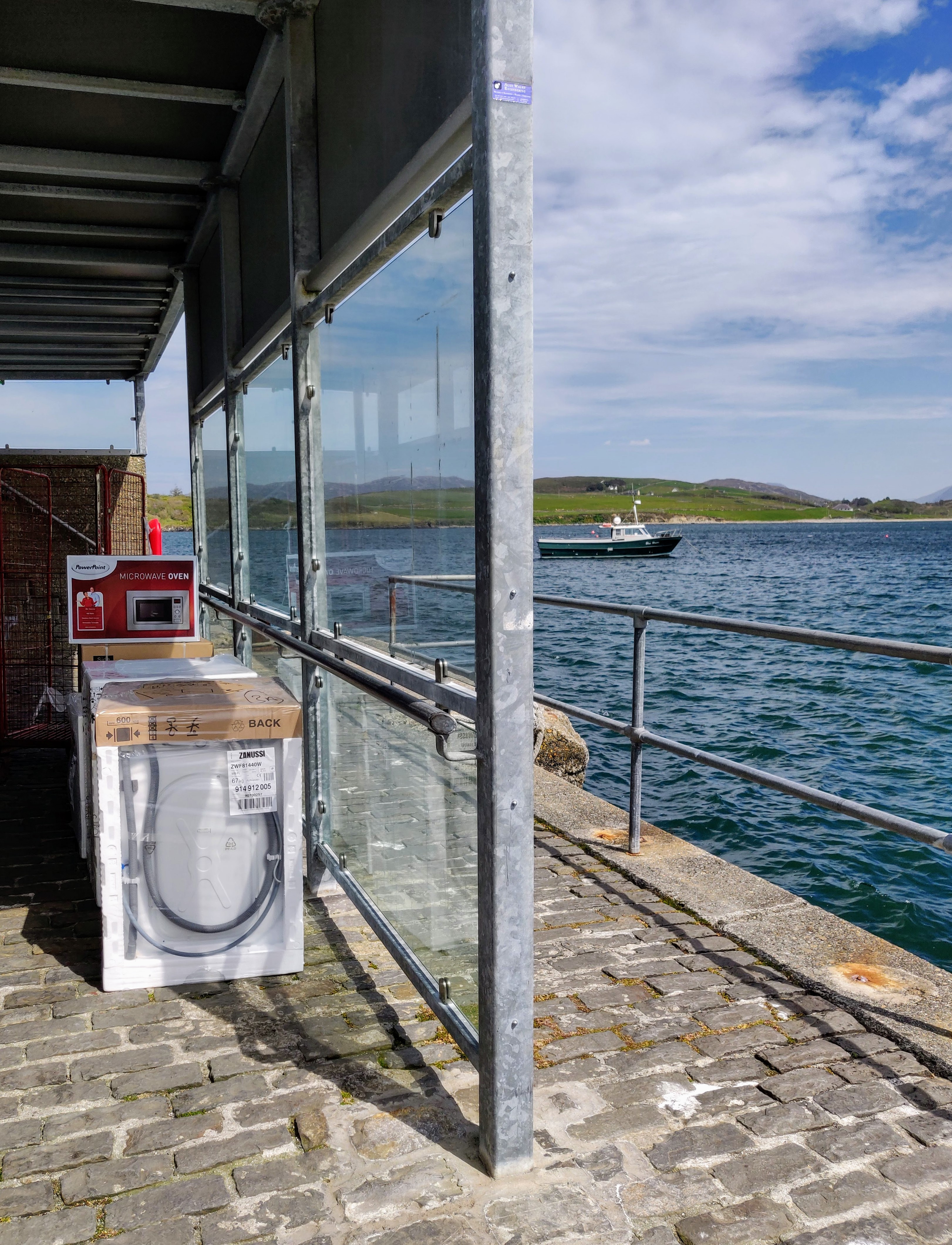 Day two and we continued out west to take in Sylne Head and Cleggan Head. The scenery is amazing and, again, well worth taking the side roads to the viewpoints. Derrigimlagh is the site of the world’s first permanent transatlantic radio station built by Italian inventor Guglielmo Marconi. The first transatlantic radio signal was transmitted in 1907. It is also a memorial site to Alcock and Brown – the first pilots to fly non-stop across the Atlantic who crash landed in Derrigimlagh Bog. This had extra significance for as since we visited a museum exhibition to them in Washington in January. Our journey north took us over the Sky Road viewpoint to Omey Island, a tidal island accessible by foot at low tide – lovely to see horse trekking across the beach. We stopped for lunch at Oliver’s on Cleggan Pier, highly recommended, and enjoyed a little libation for Paul’s birthday. Boats leave Cleggan harbour for Inishbofin – looked like someone was getting a new kitchen from the boxes and appliances stacked on the pier! On our way back to our hotel we stopped at Ballynahinch Castle for another birthday tipple – when we win the lottery we are definitely going to stay there!