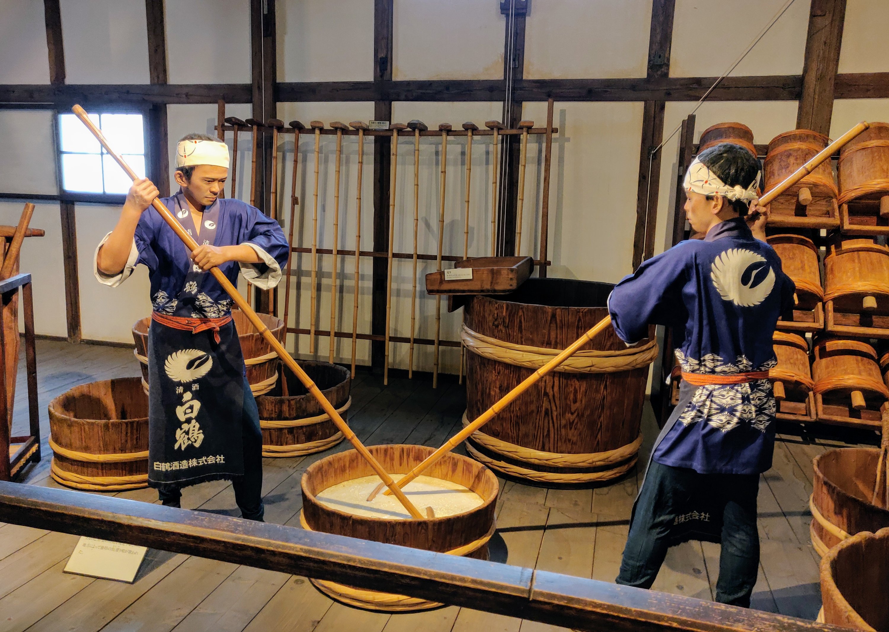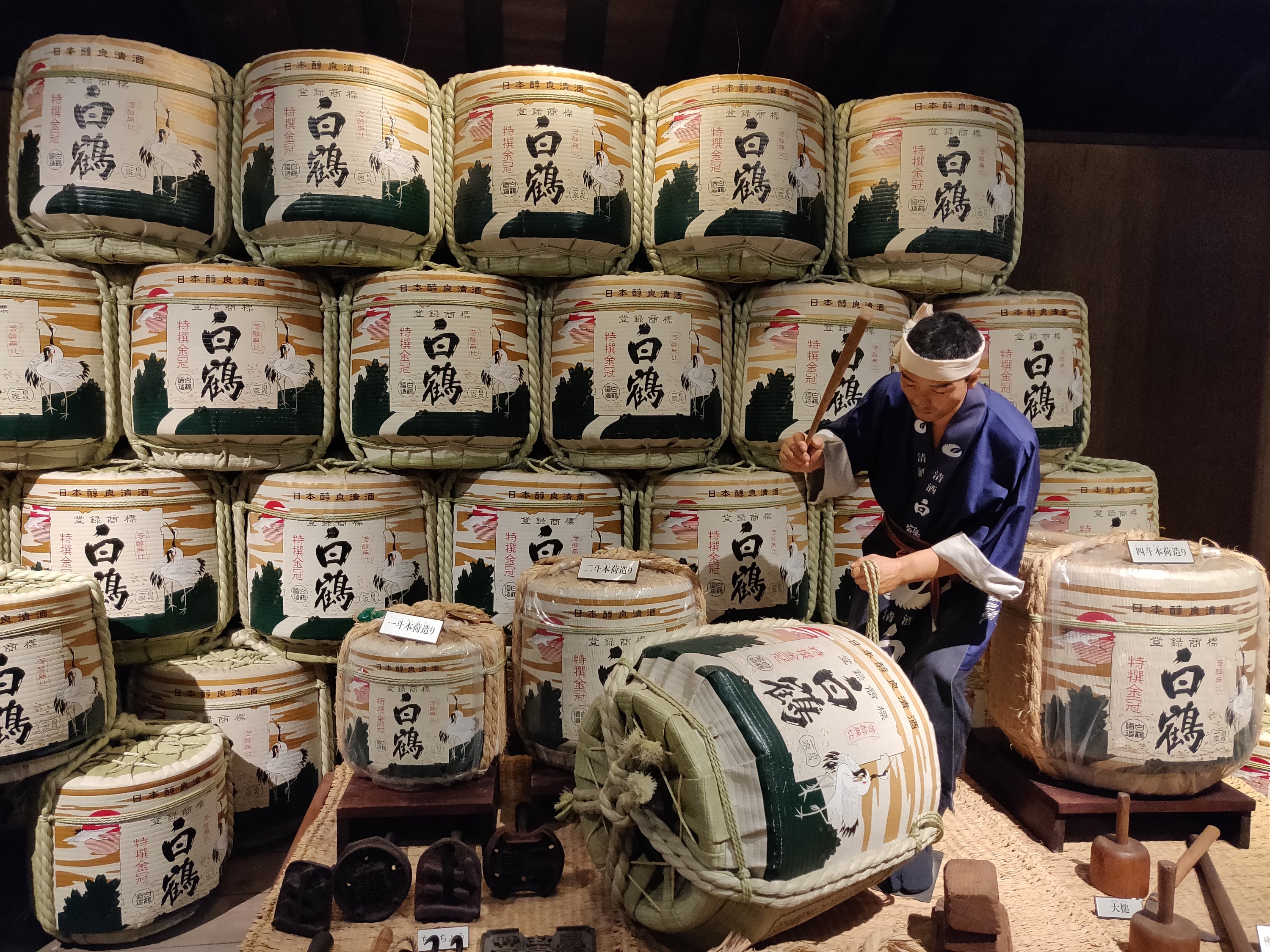 The first stop on our exploration was to Hakutsuru Sake museum, courtesy of Lonely Planet. Sake is Japanese rice wine, an alcoholic beverage made by fermenting rice hat has been polished to remove the bran. Despite the name, unlike wine, in which alcohol is produced by fermenting sugar that is naturally present in fruit, sake is produced by a brewing process more akin to that of beer, where starch is converted into sugars, which ferment into alcohol. It was a short exhibition with excellent full size diorama exhibits and a help yourself tasting bar at the end…. that was the best bit for Paul, not like the one glass at Bushmills.