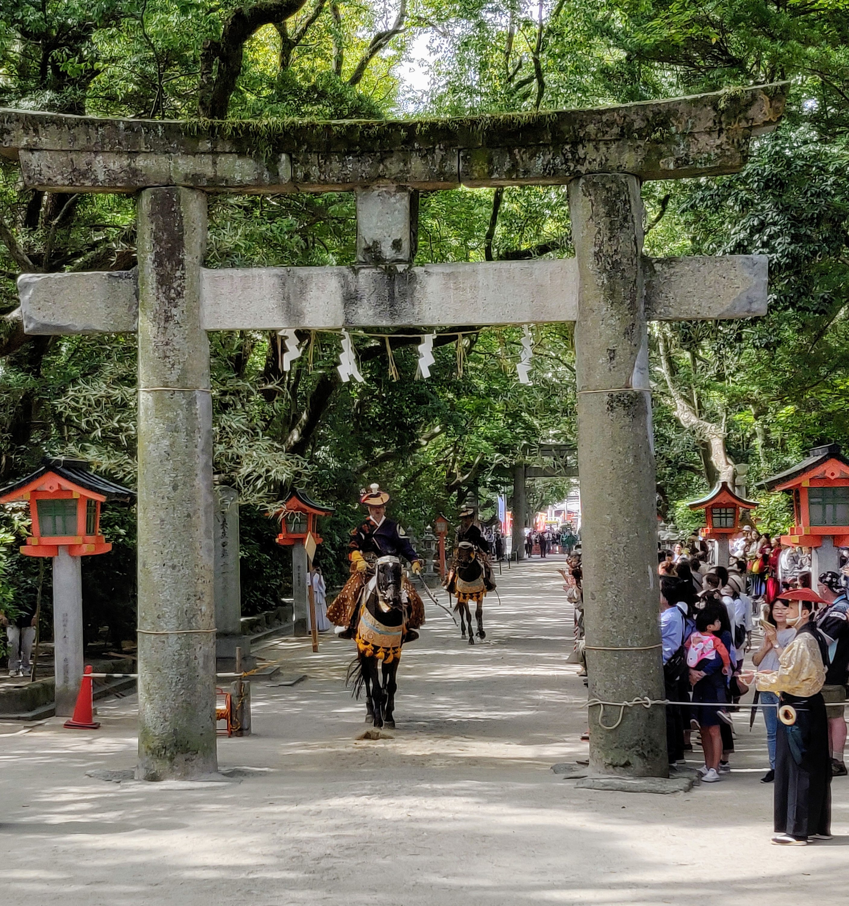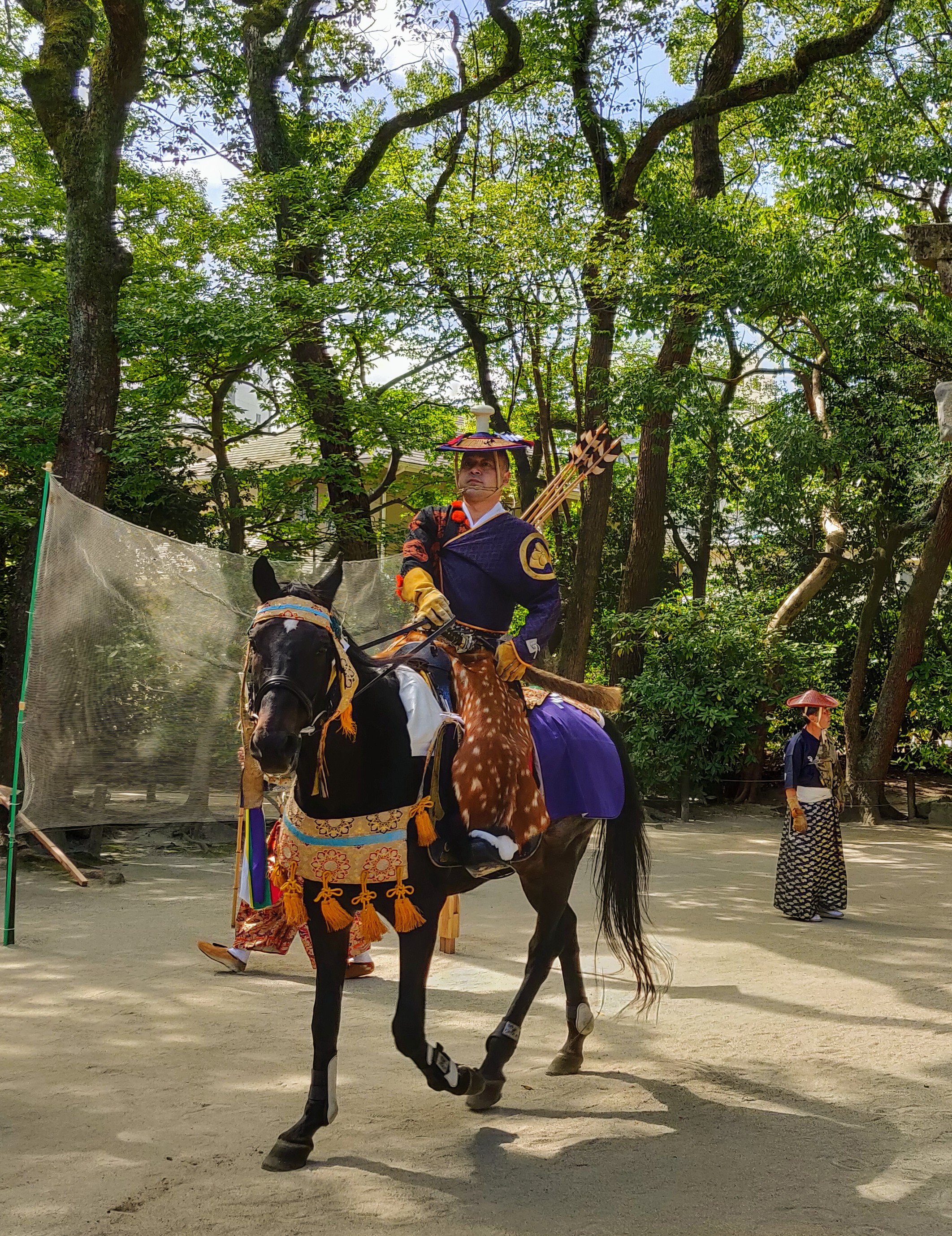 From the shrine website it appears this is ceremony commerates Emperor Jin Gong going to Korea… he was grateful for his safe return due to the sacred virtue of Sumiyoshi Daijin, and comforted his sacredness with “sumo” and “fluid horse”. There appeared to be three parts to each part of the ceremony, maybe something to do with the three god’s….