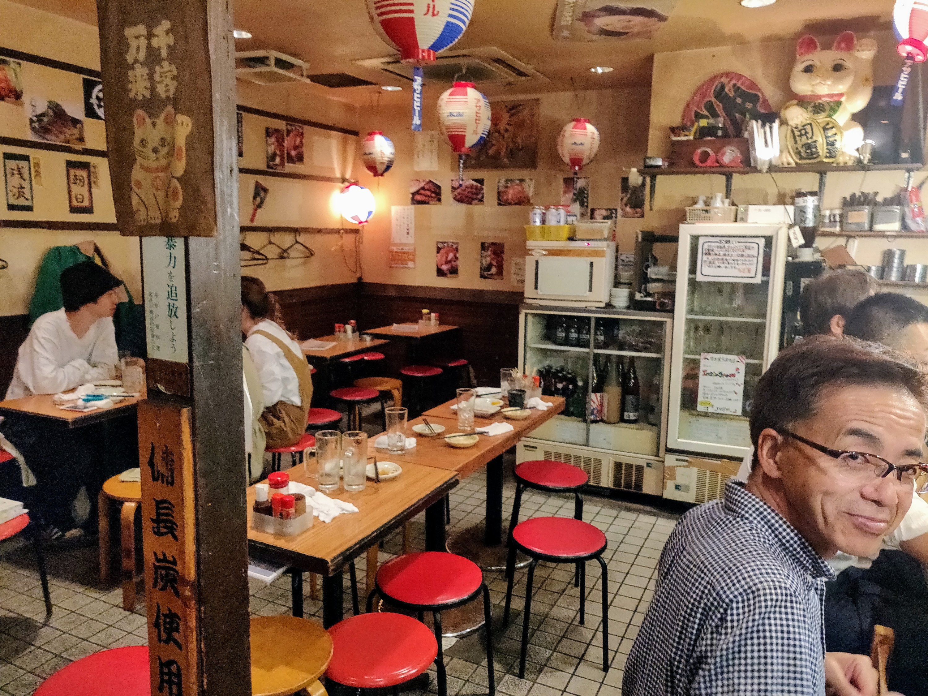 Within 500 yds of our hotel, in a direction we hadn’t been, we came across a advertising board for a restaurant with a big A4 notice stuck to it saying “rugby and yakitori”. Have I already mentioned how difficult it is to see matches in Japan? The guys went in to see what the story was and secured us a seat in front of the television for the Japan Scotland match.