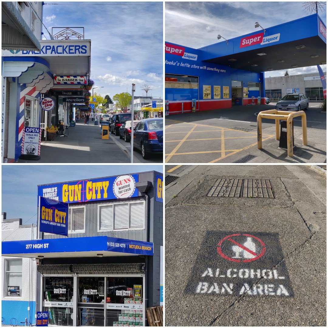 Our overnight stop was in Motueka. It is, after Richmond, the second largest centre in the Tasman Region, with a population of 7125. It has a long, low main street which is very common here. It has the drive through liquor store, another regular sight on our trip. It has the no alcohol warnings like most towns, though painted on the footpath! What it had that we haven’t seen at all in nearly three weeks was a gun store!
